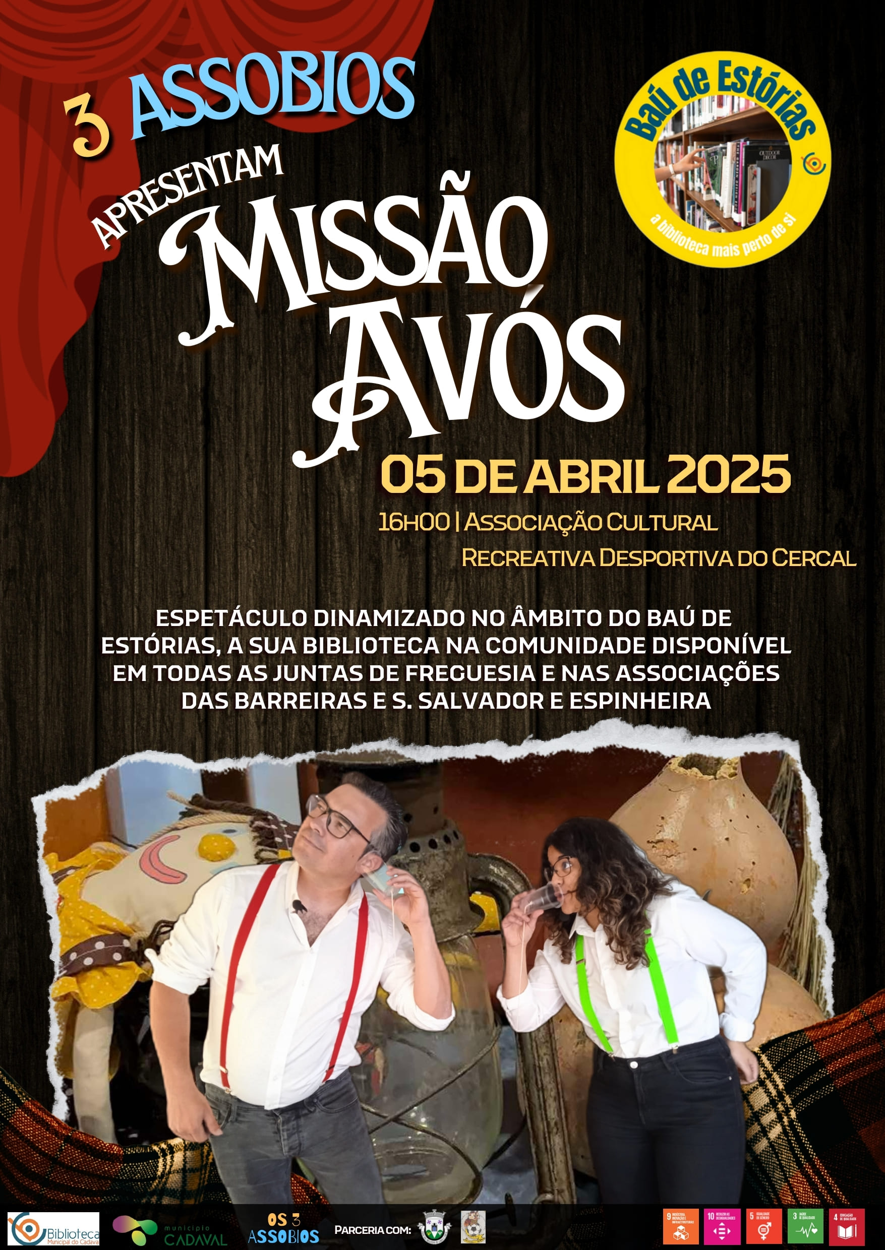 O projeto Baú de Estórias continua a promover a cultura e o entretenimento nas freguesias do concelho. No próximo sábado, 5 de abril, será a vez da Freguesia de Lamas e Cercal receber o espetáculo “Missão Avós”, uma performance divertida e cheia de significado da dupla “3 Assobios”.